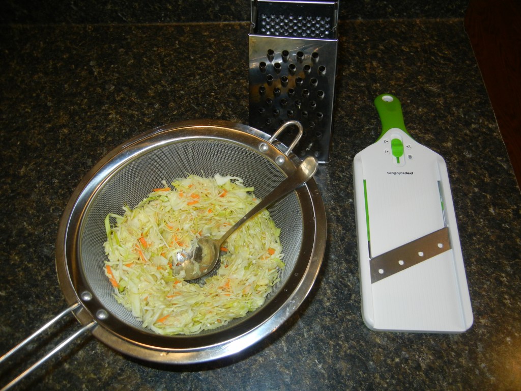 First make your brine, combine all the ingredients except cabbage and carrot (reserve mayonnaise) This is your brine and is what you will use to make it all happen. Cut your half head of cabbage into 2 section’s you want about 2″ to 3″ fine cut pieces. I used the #1 setting on the mandolin and grated my carrots separately.